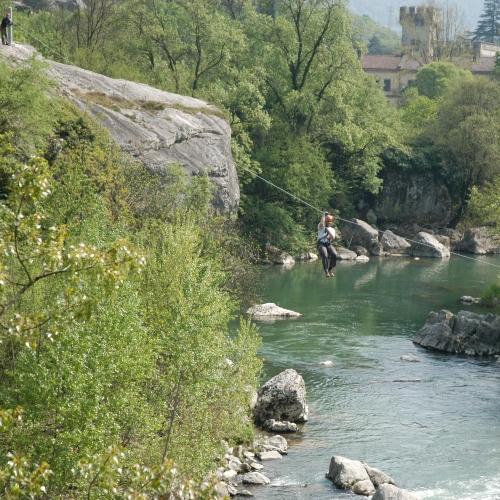 Grande impegno per l'innovazione nel parco di Drò, in trentino. In questo sito si è ben dimostrata la nostra vocazione di disegnare un parco sfruttando le specificità del territorio. Pochi alberi, massi enormi (qui si chiamano marocche) ed un vero fiume da poter attraversare. Ecco allora passaggi ancorati su roccia e pali artificiali e 2 teleferiche lunghe più di 200 metri che sorvolano scogli e rapide. In totale 50 elementi su 5 percorsi.